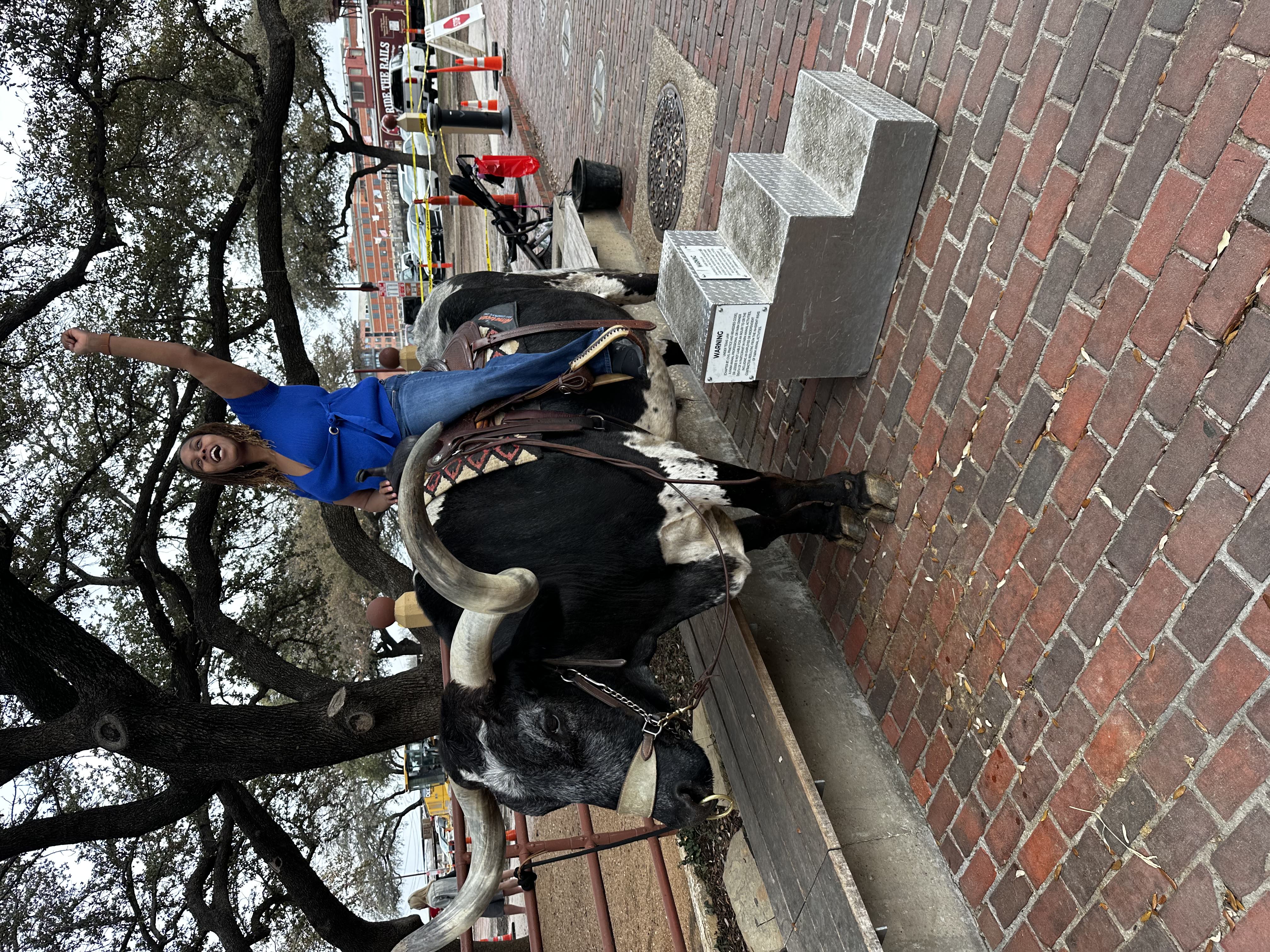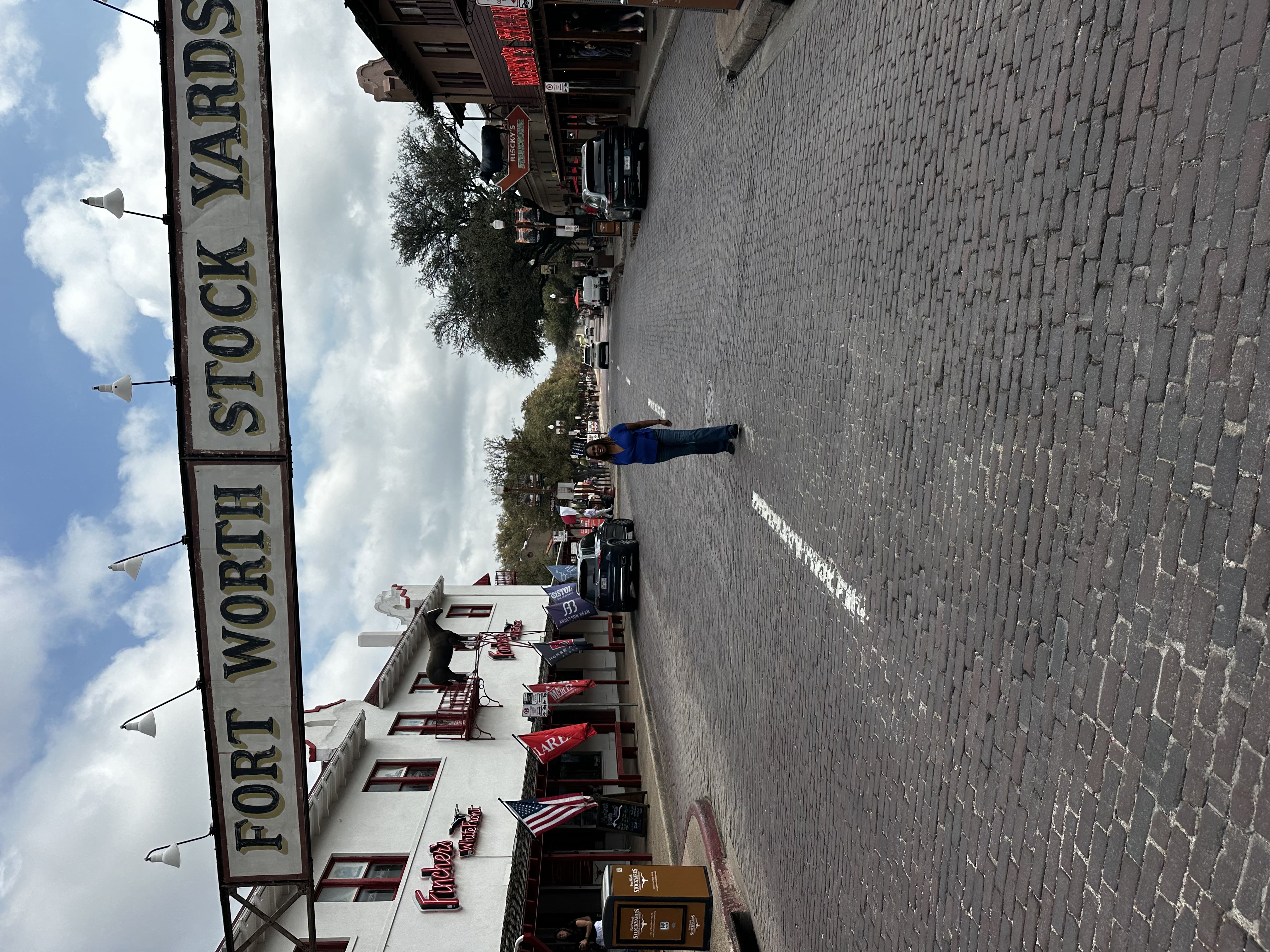 We got to climb up and take photos on top of a longhorn — which is an experience I didn’t know I needed in my life until it happened. Beyond that, the Stockyards are lined with amazing shops and stores. I bought a denim cowboy hat from Wrangler here, which I wore for the rest of the trip and am still not apologizing for. There are western wear stores, leather goods, food spots, live music — the whole thing.